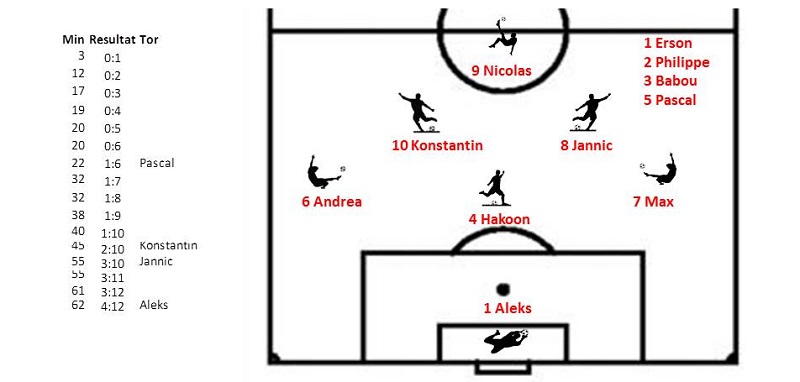 Unser Gegner zeigte von Beginn weg, dass gute Ballkontrolle, genaues Passspiel und schneller Abschluss und das vermeiden von Abspielfehlern in dieser Stärkeklasse zum Erfolg führen. Nach dem 0:6 im ersten Drittel konnten wir uns besser in Szene setzen und das letzte Dŕittel noch mit 3:2 gewinnen.