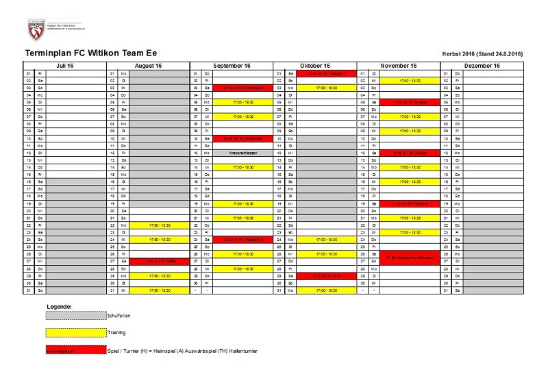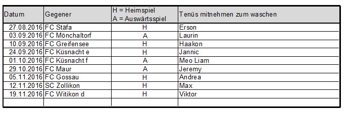 | Besonderes | Nächster Termin: Training, Mittwoch, 14.09.2016, 17.00h, Witikon Training vom Montag 11. September entfällt - Knabenschiessen Aufgebotene Spieler, die aus irgendeinem Grund nicht teilnehmen können, bitte so rasch als möglich bei Ernst (079 236 10 49) abmelden. |