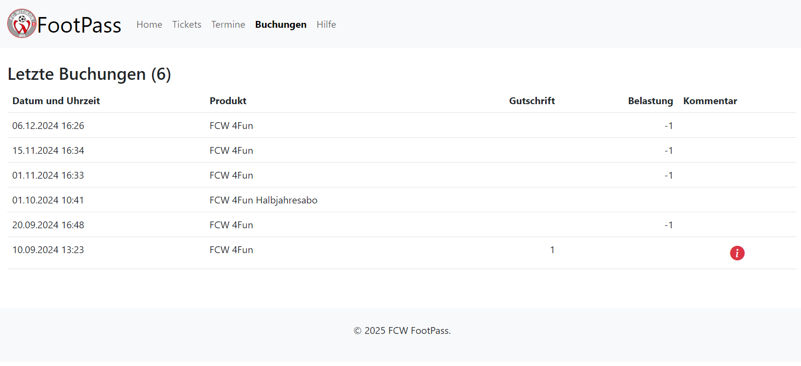 Auf der Buchungen-Seite werden die letzten Buchungen auf dem FootPass angezeigt.