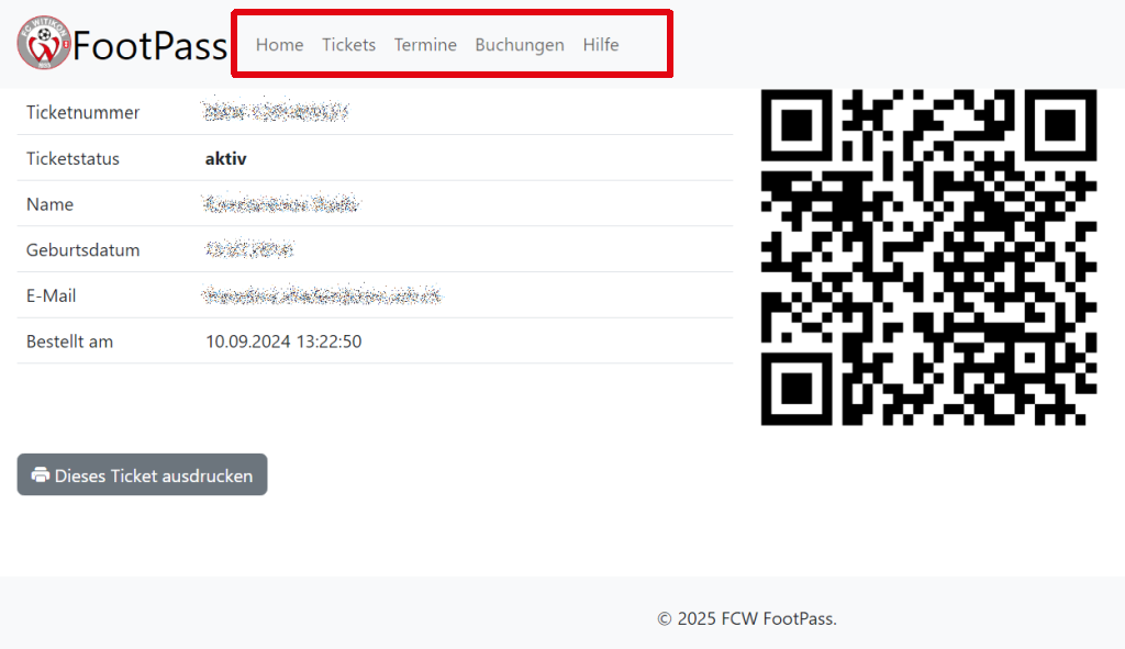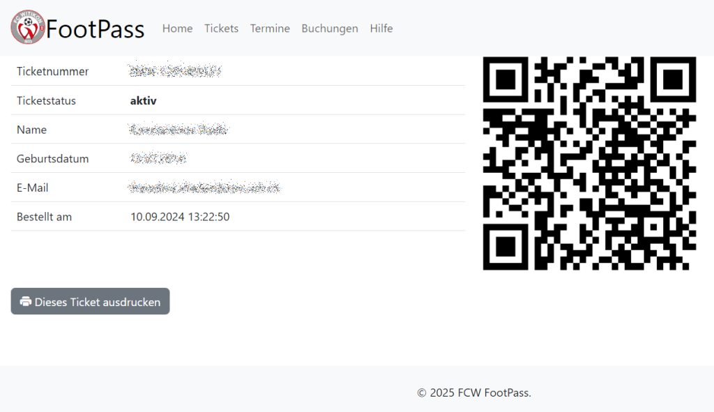 Hier stehen die persönlichen Angaben der besitzenden Person (Name, Geburtsdatum, E-Mail) sowie Informationen zum Ticket (Nummer, Status). Der QR-Code dient dazu, dass das Ticket von einem Trainer oder einem Funktionär des FC Witikon eingescannt und das Guthaben kontrolliert werden kann.