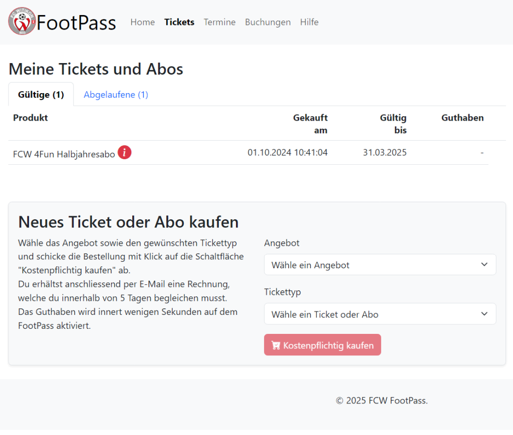 Im Abschnitt "Neues Ticket oder Abo kaufen" kann man zu einem bestimmten Angebot neues Guthaben kaufen. Das Angebot kann geändert werden. Für die meisten Angebote stehen unter Tickettyp mehrere Optionen zur Verfügung, z.B. Einzeleintritte oder Mehrfacheintritte. Mit der Schaltfläche «Kostenpflichtig kaufen» wird die Bestellung ausgelöst. Das Guthaben wird sofort gutgeschrieben. Anschliessend verschickt das System eine Rechnung an die im FootPass erfasste E-Mail-Adresse. Diese Rechnung ist in der Regel innert weniger Tage zu bezahlen.