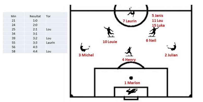 In den ersten 20 Minuten erarbeitete sich das Team Chance um Chance. Entweder wurde der Abschluss vor demm Tor vertändelt, vom gegnerischen Goali abgewehrt oder der Ball flog über oder neben das Tor.