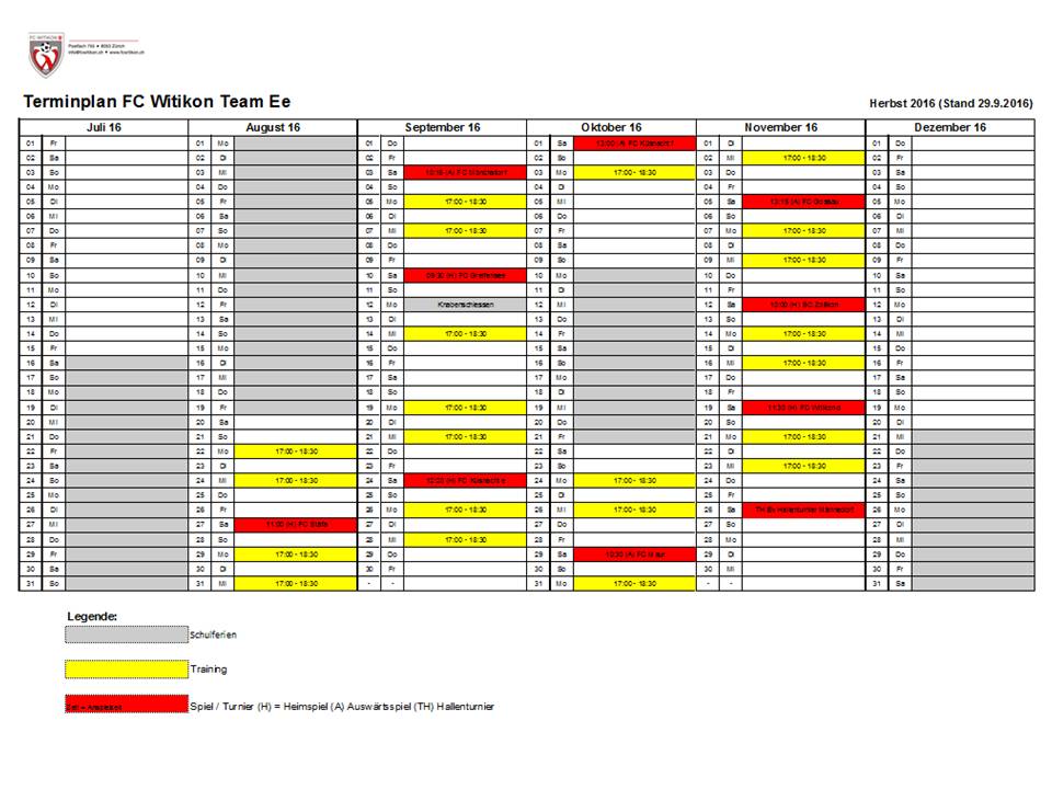 | Besonderes | Nächster Termin: Training, Mittwoch, 14.09.2016, 17.00h, Witikon Training vom Montag 11. September entfällt - Knabenschiessen Aufgebotene Spieler, die aus irgendeinem Grund nicht teilnehmen können, bitte so rasch als möglich bei Ernst (079 236 10 49) abmelden. |